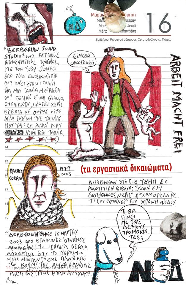 Όταν κάποιος σου λέει ότι πλούτισε με σκληρή δουλειά, ρώτησέ τον: «τίνος;» …Don Marquis. «Οικογενειακές» ιστορίες και δεξιοί βομβιστές. 16 Μαρτίου του 2003 δολοφονήθηκε η Rachel Corrie. Η ταινία της ημέρας: “Berberian Sound Studio” 2012.