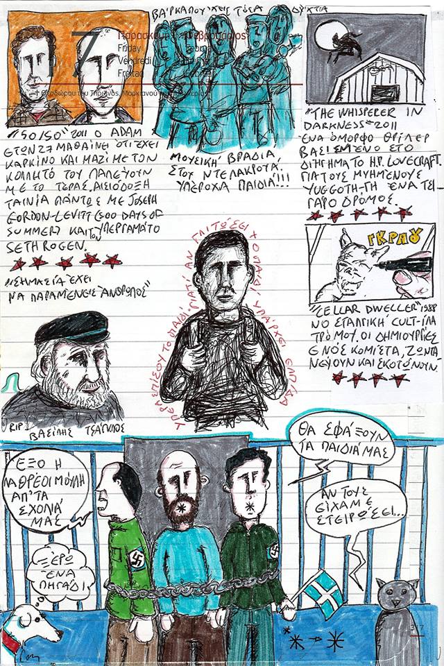 Εξαμβλώματα πιθήκων ντύθηκαν «πατριώτες» και αλυσοδέθηκαν για να εμποδίσουν μικρά παιδιά που γλίτωσαν από την κόλαση να πάνε στο σχολείο. Την Πέμπτη έφυγε απ’ τη ζωή και ο ηθοποιός Βασίλης Τσάγκλος. Το βράδυ καμαρώσαμε τα παιδιά στη μουσική εκδήλωση στου Ντελακρουά. Τρεις ταινίες: «50/50» 2011, «The Whisperer In Darkness» 2011 & «Cellar Dweller» 1988.