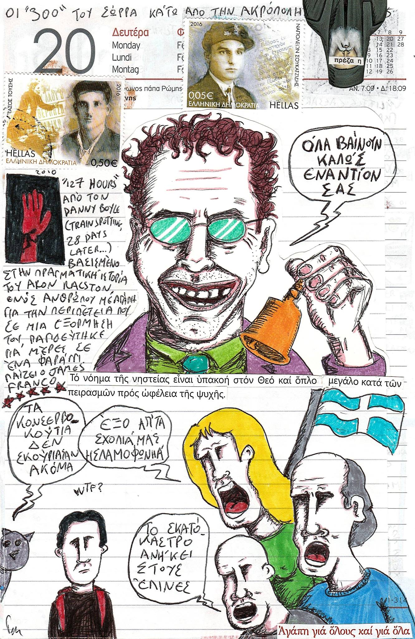 Χειραψίες, συμφωνίες, διαβεβαιώσεις και όλα βαίνουν καλώς εναντίον μας, με χαμόγελα και καμπανάκια… Οι «300» του Ελλάνιου σωτήρα ορκίστηκαν κάτω από την Ακρόπολη. Στο φιλόξενο Ωραιόκαστρο συνεχίζονται οι πατριωτικές εκδηλώσεις, καθώς οι λιλιπούτειοι πράκτορες του Ισλαμικού κράτους, έχουν εισχωρήσει στα σχολεία για να στρατολογήσουν Χριστιανόπουλα. Είδα “127 hours” 2010 του Danny Boyle.