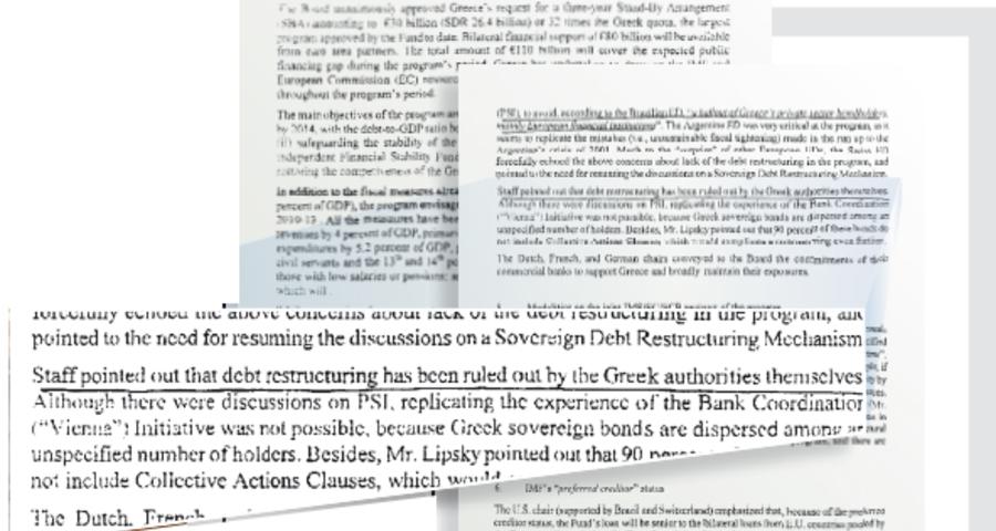 The Ethnos article also refers to a June 2013 report by the IMF over the handling of the Greek crisis according to which (page 49) “Greece itself and the European partners were opposed to a debt restructuring over concerns regarding the internal political cost, consequences for pension funds and contagion.”