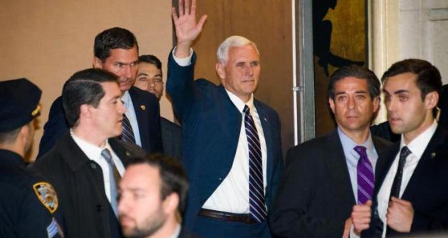 Μετά την παράσταση, μέλος του θιάσου ευχαρίστησε τον αντιπρόεδρο του Τραμπ που παρευρέθηκε στο μιούζικαλ και του διάβασε επιστολή.
