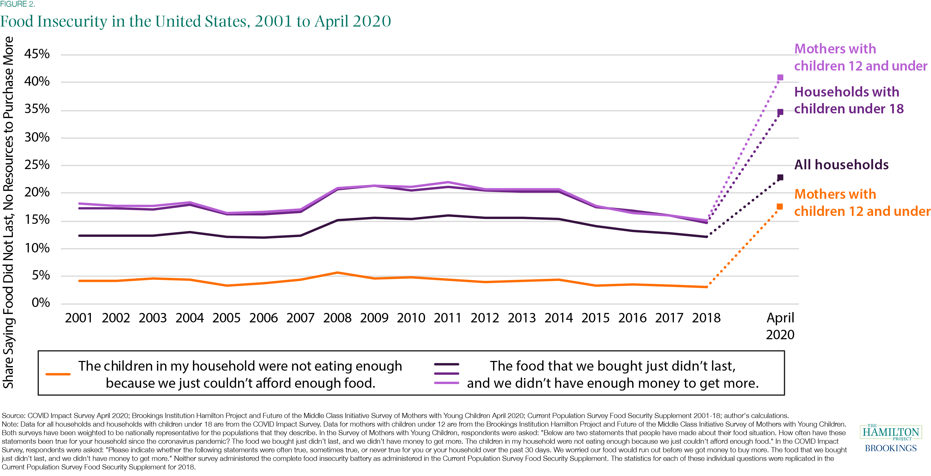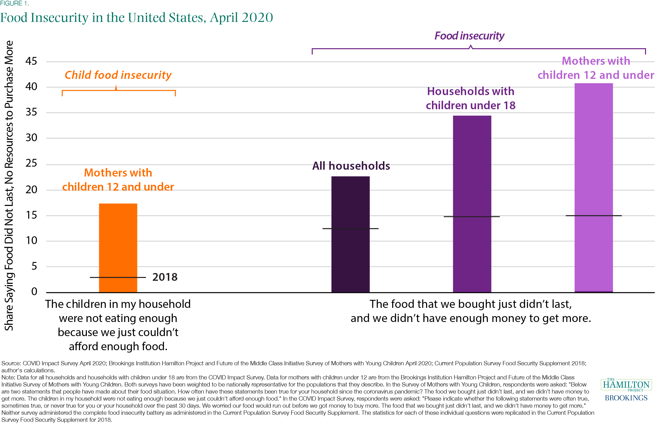 Η  Λόρεν Μπάουερ, που συνέταξε την έκθεση για το Brookings Institution, υπογραμμίζει ότι η διατροφική ανασφάλεια των νοικοκυριών με παιδιά 18 ετών και μικρότερα αυξήθηκε κατά 130% σε σύγκριση με το 2018, προσθέτοντας πως το πρόβλημα επιδεινώνει η διακοπή των προγραμμάτων προσφοράς γευμάτων στα παιδιά στα σχολεία, αφού έχουν κλείσει λόγω της πανδημίας.