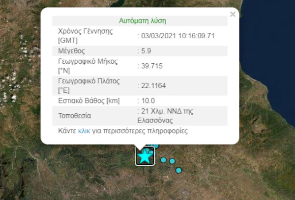 Οι πρώτες πληροφορίες κάνουν λόγο για δόνηση 6 ρίχτερ 21 χλμ νοτιοδυτικά της Ελασσόνας. Το εστιακό βάθος υπολογίζεται στα 10 χλμ.