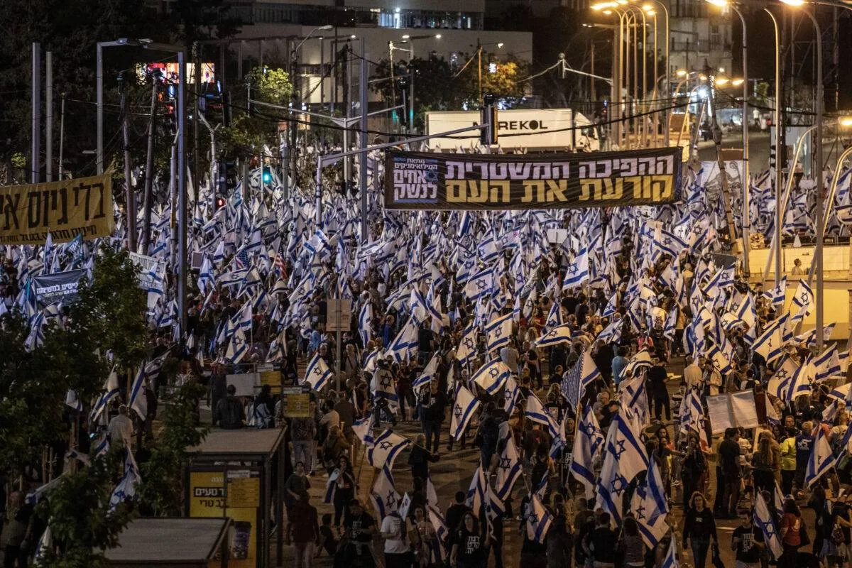 Πλήθη συγκεντρώθηκαν στο κέντρο του Τελ Αβίβ το Σάββατο σε μια επίδειξη περιφρόνησης ενάντια σε σχέδια που θεωρούν ως υπαρξιακή απειλή για την ισραηλινή δημοκρατία, όπως μεταδίδει το Reuters.