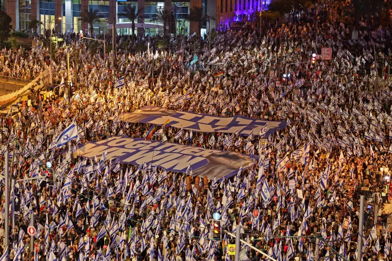 Οι μαζικές διαδηλώσεις, που συγκέντρωσαν περίπου 100.000 άτομα το Σάββατο, ξεκίνησαν τον Ιανουάριο λίγο μετά την ορκωμοσία της ακροδεξιάς κυβέρνησης του Νετανιάχου.
