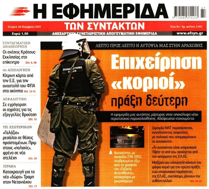 Μία ημέρα αργότερα, η εφημερίδα επανήλθε, και μάλιστα με ακόμα μεγαλύτερη αποκάλυψη. Ουσιαστικά, η αστυνομία πιάστηκε «επ’ αυτοφώρω», καθώς ένα εντυπωσιακό και ατράνταχτο ντοκουμέντο της καταγράφει αυτοκίνητο της Ασφάλειας έξω από τα γραφεία της αναρχικής – κομμουνιστικής συλλογικότητας «Ταξική Αντεπίθεση», το οποίο έφερε κρυφή κάμερα, και όταν έγινε αντιληπτό, απροκάλυπτα εμφανίστηκε διμοιρία των ΜΑΤ για να το φυγαδεύσει.