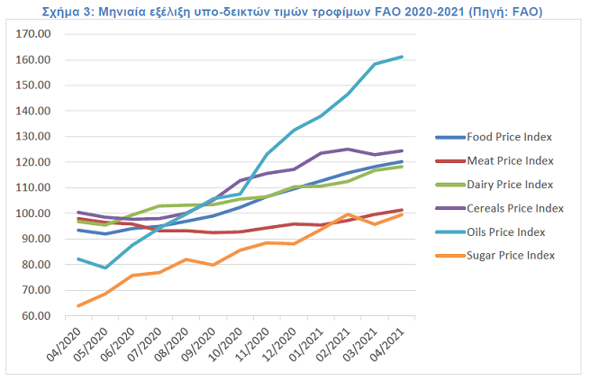 Αντίστοιχα ευρήματα προκύπτουν και από τον Παγκόσμιο Οργανισμό Τροφίμων και Γεωργίας των Ηνωμένων Εθνών (FAO).Ο δείκτης τιμών τροφίμων FAO, ή FAO Food Price Index (FFPI), μετράει τη μηνιαία μεταβολή στις διεθνείς τιμές ενός καλαθιού πρώτων υλών. Ο δείκτης έφτασε τον Απρίλιο του 2021 στις 120,9 μονάδες, 28,4 μονάδες αυξημένος σε σχέση με τον Απρίλιο του 2020, ενώ κατέγραψε για 11ο συνεχόμενο μήνα αύξηση στην τιμή του φτάνοντας στο υψηλότερο επίπεδο των τελευταίων ετών.