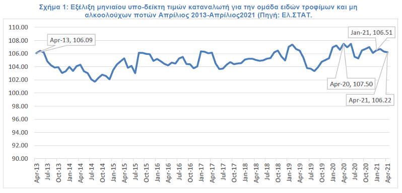 Σύμφωνα με τα δημοσιευμένα στοιχεία της ΕΛΣΤΑΤ (Ελληνική Στατιστική Αρχή) ο υπό-δείκτης τιμών καταναλωτή για την ομάδα των ειδών τροφίμων και μη αλκοολούχων ποτών τον Απρίλιο του 2021 με τιμή 106,22 βρίσκεται στο ίδιο επίπεδο με τον Απρίλιο του 2013 με τιμή 106,09. Παράλληλα δεν φαίνεται να καταγράφονται σημαντικές διακυμάνσεις το 2021.
