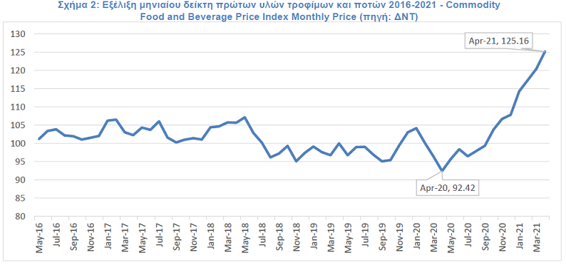 Παράλληλα, όμως, ανησυχητικά μηνύματα έρχονται από τους διεθνείς δείκτες. Ο δείκτης πρώτων υλών τροφίμων και ποτών του Διεθνούς Νομισματικού Ταμείου (Commodity Food and Beverage Price Index Monthly Price) καταγράφει σε ένα μόλις χρόνο εξαιρετικά μεγάλη αύξηση άνω του 30%, από 92,42 τον Απρίλιο του 2020 σε 125,16 τον Απρίλιο του 2021. Οι αυξήσεις αυτές οφείλονται κυρίως στις αυξήσεις των πρώτων υλών παραγωγής και όχι τόσο στις αυξήσεις του κόστους ενέργειας.