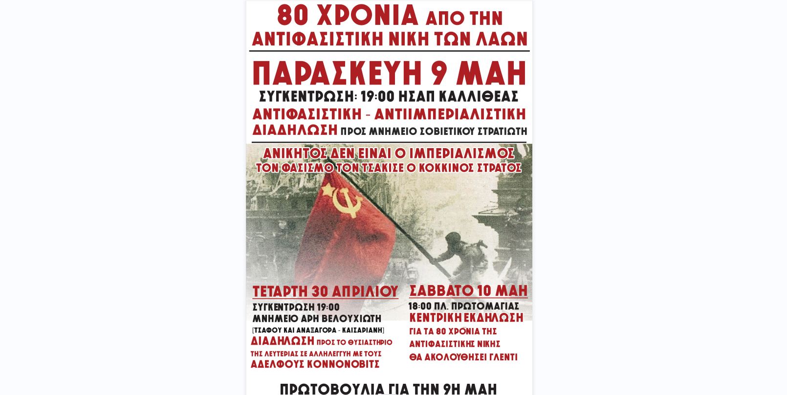 Γ) Σάββατο 10 Μαῒου, 18:00 Πλατεία Πρωτομαγιάς, κεντρική εκδήλωση για τα 80 χρόνια της αντιφασιστικής νίκης των λαών και γλέντι, με κουβέντα, τραγούδια και χορό τιμάμε τα 80 χρόνια της αντιφασιστικής νίκης των λαών!