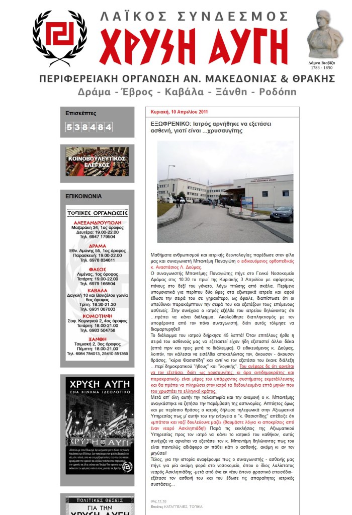 Η Χρυσή Αυγή παλιότερα διαφήμιζε τα “κατορθώματα” του “συναγωνιστή”, για παράδειγμα όταν είχε αντιπαρατεθεί με ειδικευόμενο γιατρό στο νοσοκομείο της Δράμας:
