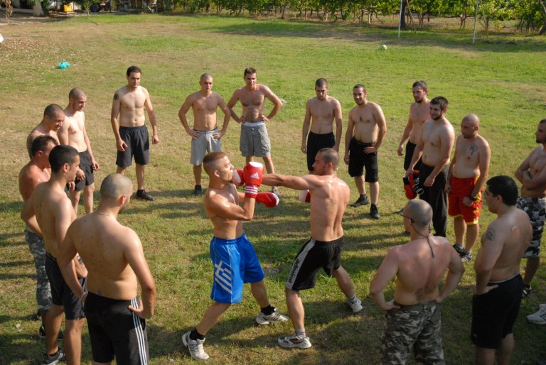 Ο Κασιδιάρης εκπαιδεύει, Μπαντέμης και Ματθαιόπουλος παρακολουθούν.
