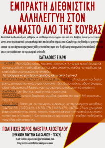 «Εδώ και δεκαετίες ο αδάμαστος λαός της Κούβας αγωνίζεται απέναντι στον αμερικανικό ιμπεριαλισμό, στεκόμενος στο πλάι των λαών ολόκληρου του κόσμου», «στέκεται αλληλέγγυος με έμπρακτο τρόπο στους λαούς του λεγόμενου «3ου κόσμου», εκεί που η ‘ανθρωπιστική’ βοήθεια κανενός ιμπεριαλιστικού κράτους δεν φτάνει, παρά μόνο για να ληστέψει την γη και τον ορυκτό πλούτο των λαών», ωστόσο «η υγειονομική κρίση που βιώσαμε σε συνδυασμό με το σκληρό μακροχρόνιο εμπάργκο που έχει επιβάλει ο αμερικάνικος ιμπεριαλισμός εδώ και 60 χρόνια έχει δυσκολέψει τις συνθήκες διαβίωσης του αδάμαστου κουβανικού λαού τόσο σε οικονομικό όσο και σε υγειονομικό επίπεδο», προσθέτει το κάλεσμα.