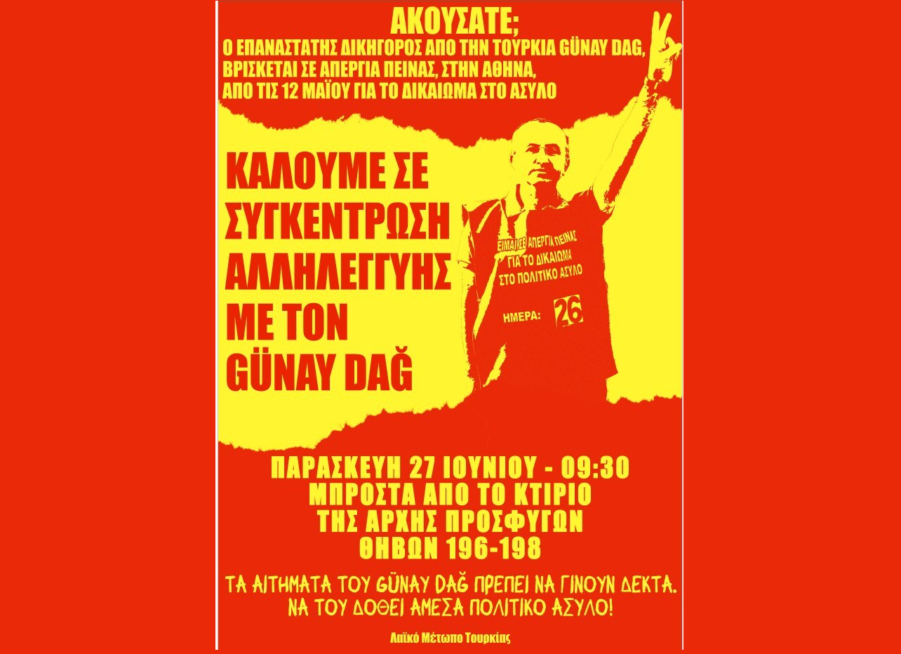 Ο Günay Dağ ξεκίνησε απεργία πείνας στις 12 Μαΐου για να διαμαρτυρηθεί για την αυθαίρετη και παράνομη ανάκληση του δικαιώματός του στο πολιτικό άσυλο και να απαιτήσει την αποκατάσταση του. Επιπλέον, ο Günay Dağ έχει προσφύγει κατά της παράνομης αυτής απόφασης. Η επανεξέταση της προσφυγής θα πραγματοποιηθεί την Παρασκευή 27 Ιουνίου, στις 10:00 π.μ., στην Αρχή Προσφυγών. Καλούμε όλους και όλες, τις οργανώσεις , τις συλλογικότητες, τις ομάδες, τους υπερασπιστές των ανθρωπίνων δικαιωμάτων να συμμετάσχουν σε μια συγκέντρωση αλληλεγγύης στις 27 Ιουνίου στις 9:30 π.μ. έξω από την Αρχή Διοικητικών Προσφυγών στη διεύθυνση Θηβών 196-198, όπου θα εξεταστεί η έφεση, σε αλληλεγγύη με τον Günay Dağ και όλους τους Τούρκους αιτούντες πολιτικό άσυλο των οποίων το δικαίωμα στο πολιτικό άσυλο έχει παραβιαστεί.