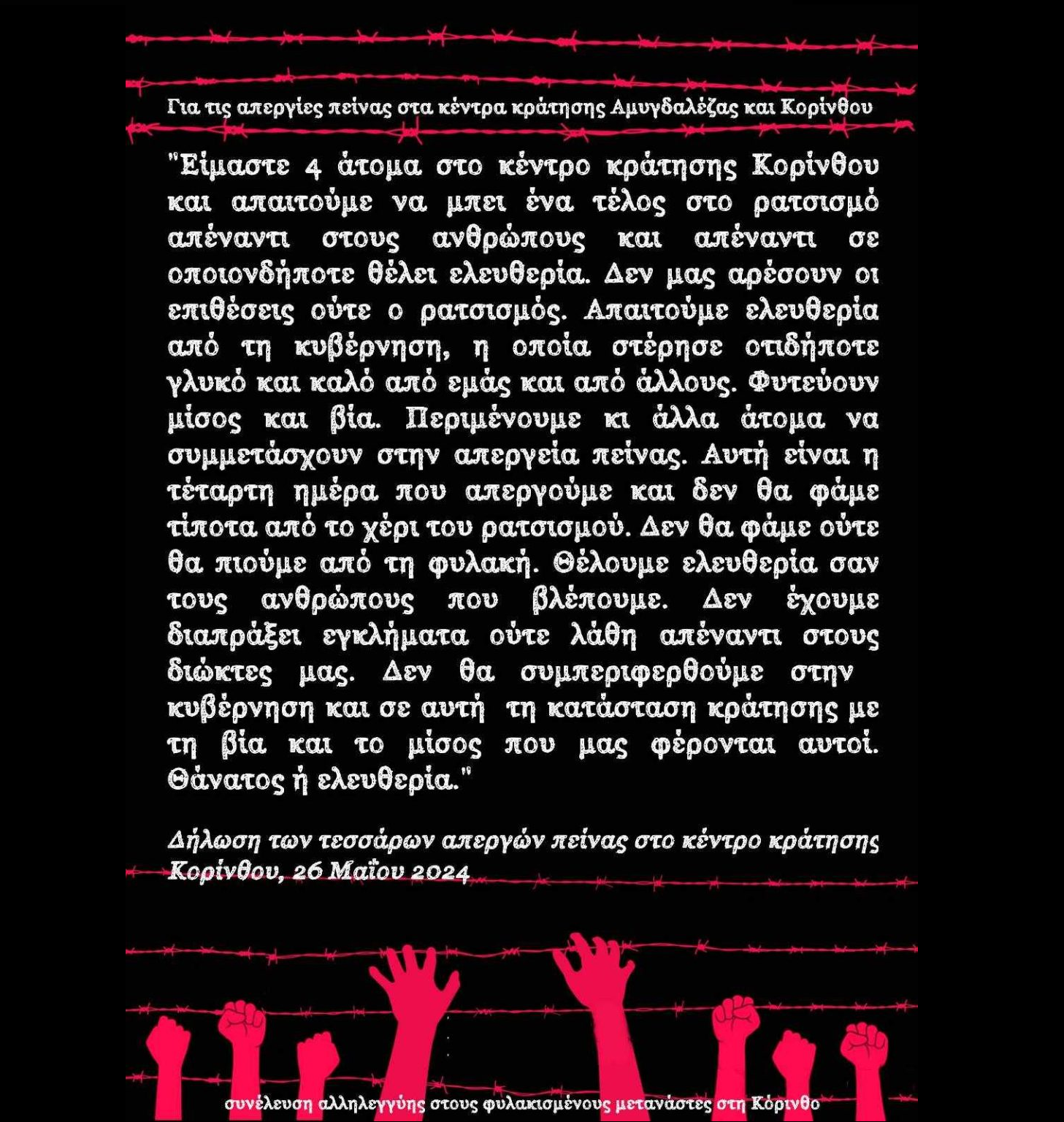 «Το Προ.Κε.Κ.Α. (Προαναχωρησιακό Κέντρο Κράτησης Αλλοδαπών) Κορίνθου όπως και οι αντίστοιχες δομές-κολαστήρια στην Αμυγδαλέζα, στο Παρανέστι της Δράμας και στο Αλλοδαπών της Πέτρου Ράλλη καταπατούν τα ανθρώπινα δικαιώματα με πρώτιστο το δικαίωμα στην ελεύθερη μετακίνηση» προσθέτει.