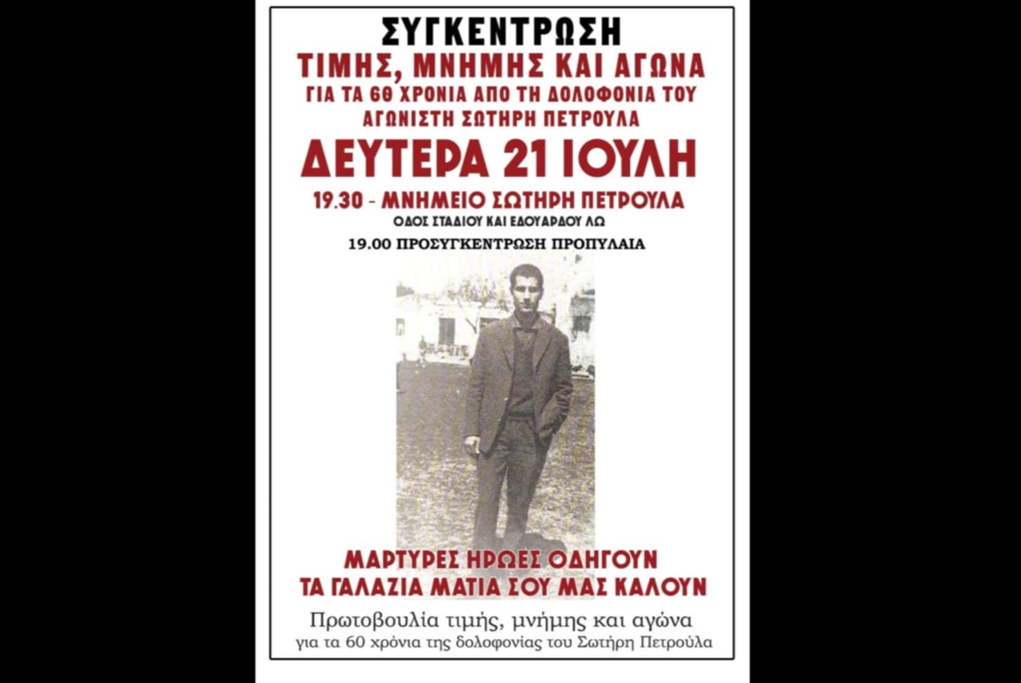 Πρωτοβουλία τιμής, μνήμης και αγώνα για τα 60 χρόνια της δολοφονίας του Σωτήρη Πετρούλα»