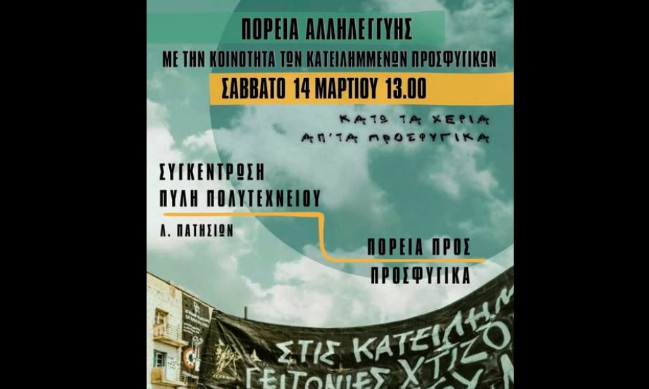 Όλες και όλοι το Σάββατο 14 Μάρτη και ώρα 13.00 στην Λ. Πατησίων έξω από την Πύλη του Πολυτεχνείου για τη μεγάλη πορεία αλληλεγγύης μέχρι τα Προσφυγικά.