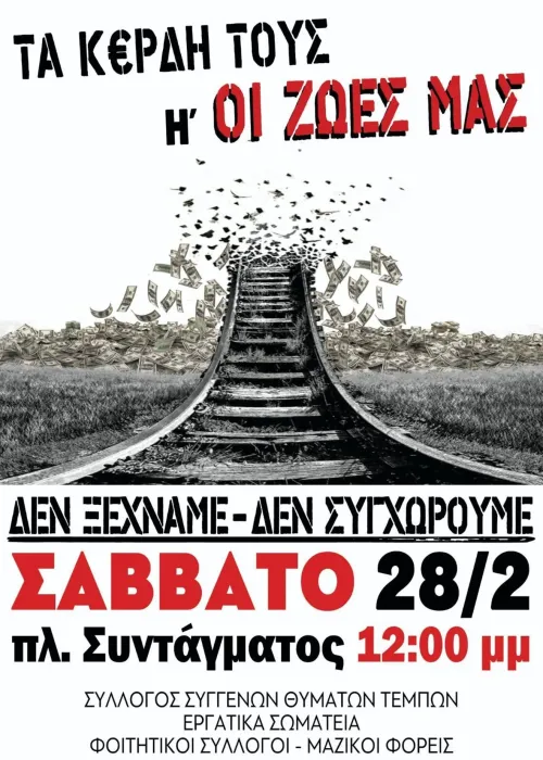 «Η Εκτελεστική Επιτροπή της Α.Δ.Ε.Δ.Υ. κηρύσσει 24ωρη απεργία για όλους τους εργαζόμενους, ανεξάρτητα από τη σχέση εργασίας, σε όλες τις Δημόσιες Υπηρεσίες, τα Ν.Π.Δ.Δ. και τους Ο.Τ.Α. που εργάζονται το Σάββατο, 28 Φλεβάρη 2026, τη μέρα που συμπληρώνονται 3 χρόνια από το προδιαγεγραμμένο έγκλημα στα Τέμπη, που στοίχισε τη ζωή σε 57 συνανθρώπους μας και συγκλόνισε ολόκληρο τον λαό. Η πραγματική δικαίωση για τα Τέμπη, για τους νεκρούς στους χώρους δουλειάς, για τα παιδιά μας, θα έρθει μέσα από τον οργανωμένο αγώνα για την ανατροπή των πολιτικών των ιδιωτικοποιήσεων, της συστηματικής απαξίωσης των δημόσιων υποδομών που ευθύνονται για το δυστύχημα, της πολιτικής που γεννά καθημερινά νέα εγκλήματα. Καλούμε τους εργαζόμενους του δημόσιου τομέα, να δώσουν μαζικό, μαχητικό παρών μαζί με τα σωματεία και τις ομοσπονδίες τους, μαζί με όλους τους εργαζόμενους και τη νεολαία, στο μεγάλο συλλαλητήριο το Σάββατο 28 Φλεβάρη, στις 12:00 στο Σύνταγμα και στα αντίστοιχα που θα γίνουν σε όλη την Ελλάδα».