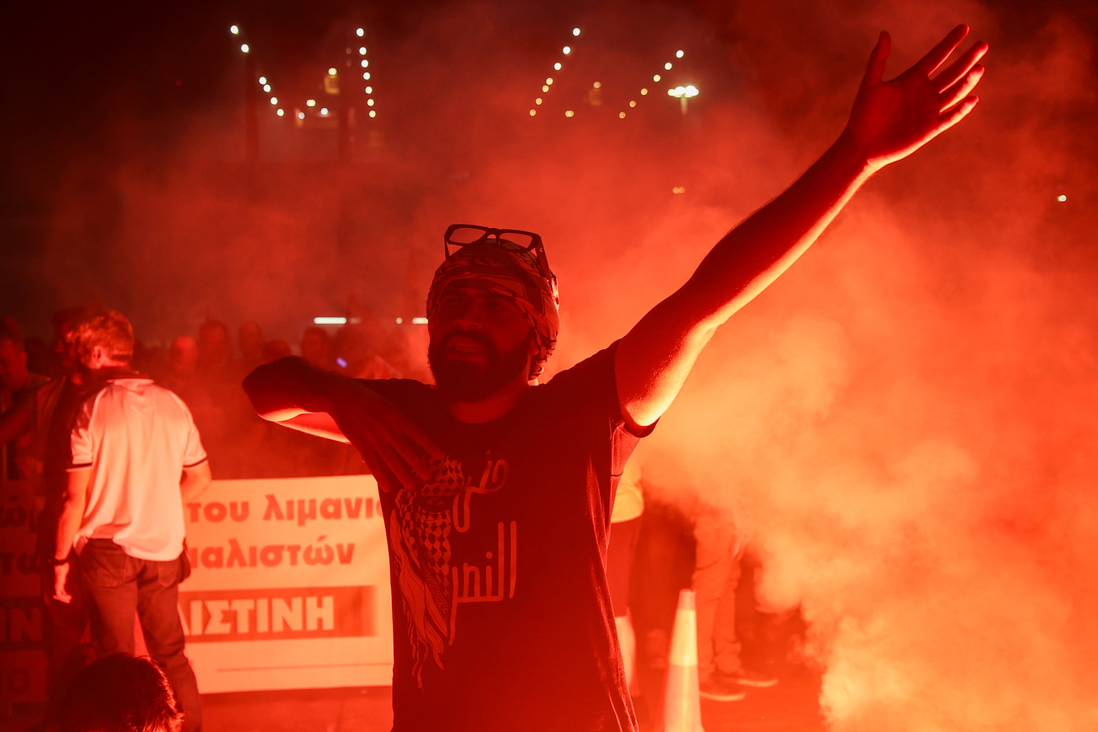Ανάμεσα στις φωνές για «Λευτεριά στην Παλαιστίνη» ξεχώρισε και το σύνθημα «Με το Ισραήλ καμία συνεργασία. Κανένα λιμάνι για τη γενοκτονία».