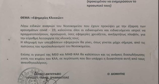 Στο “Σωτηρία”, υποτίθεται το νοσοκομείο – ναυαρχίδα στην μάχη ενάντια στην επιδημία #Covid_19, ο διοικητής καλεί τους γιατρούς να υπερεφημερεύσουν με υπέρβαση του πλαφόν λόγω έλλειψης ιατρικού προσωπικού. Αναζητούνται οι “χιλιάδες προσλήψεις” που η κυβέρνηση λέει πως τάχα έκανε. pic.twitter.com/DDd57MLMvG