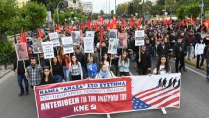 Σήμερα, από εδώ από την Αθήνα, το ΚΚΕ και η ΚΝΕ ενώνουμε τη φωνή μας με τον αμερικανικό λαό, τους νέους και τις νέες που κινητοποιούνται αυτές τις ημέρες για τα δικαιώματά τους, για να μπορέσουν να ανασάνουν!