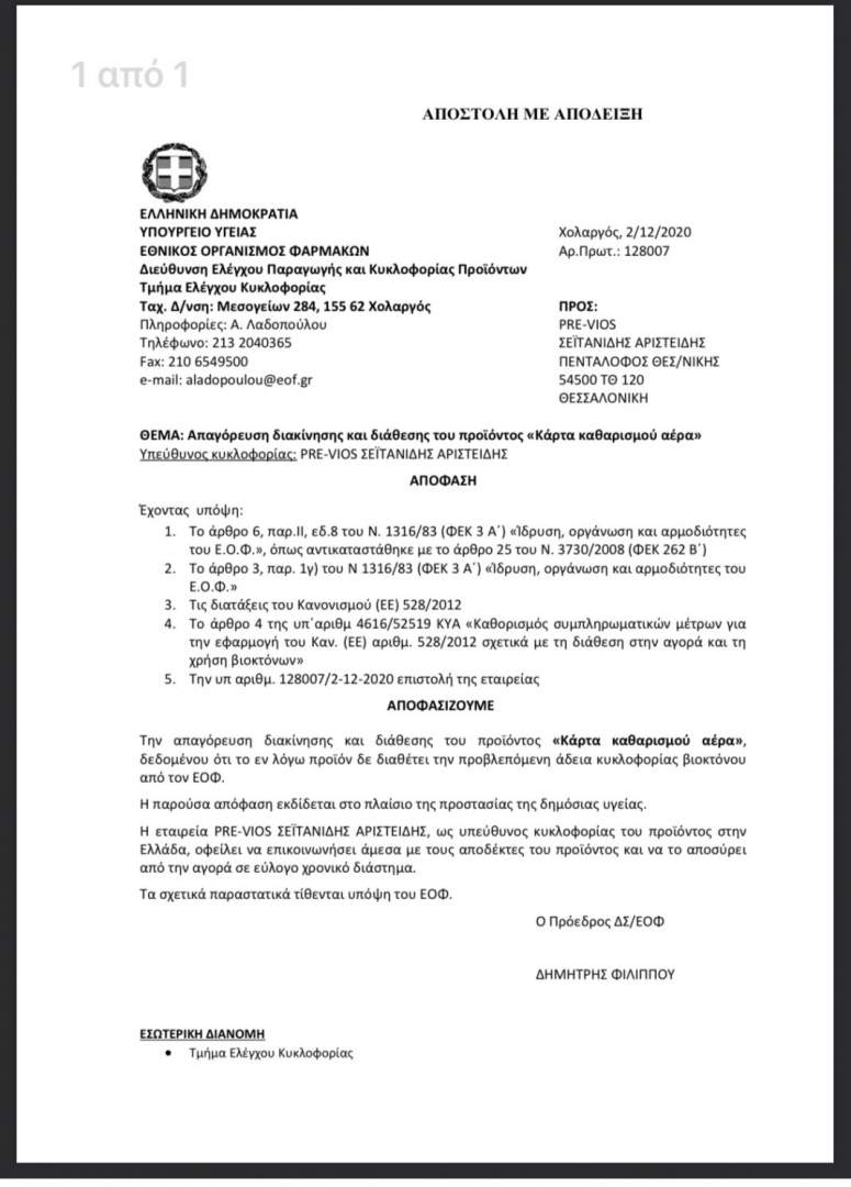 Αποφασίζουμε την απαγόρευση διακίνησης και διάθεσης του προϊόντος «Κάρτα καθαρισμού αέρα», δεδομένου ότι το εν λόγω προϊόν δε διαθέτει την προβλεπόμενη άδεια κυκλοφορίας βιοκτόνου από τον ΕΟΦ. Η παρούσα απόφαση εκδίδεται στο πλαίσιο της προστασίας της δημόσιας υγείας. Η εταιρεία PRE-VIOS ΣΕΪΤΑΝΙΔΗΣ ΑΡΙΣΤΕΙΔΗΣ, ως υπεύθυνος κυκλοφορίας του προϊόντος στην Ελλάδα, οφείλει να επικοινωνήσει άμεσα με τους αποδέκτες του προϊόντος και να το αποσύρει από την αγορά σε εύλογο χρονικό διάστημα.