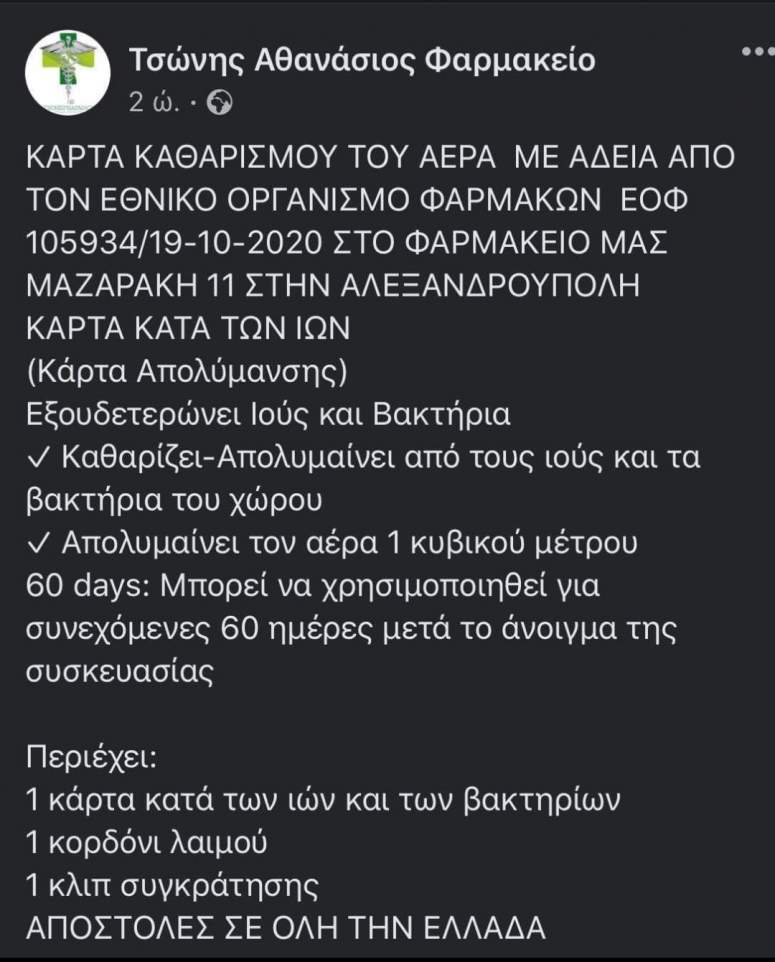 Συγκεκριμένα, σε απόφαση που έλαβε στις 2 Δεκεμβρίου ο Εθνικός Οργανισμός Φαρμάκων, σημείωνεται πως το προϊόν «Κάρτα καθαρισμού αέρα» που προωθούμε ο Αντιπεριφερειάρχης Τσώνης δεν διαθέτει την προβλεπόμενη άδεια κυκλοφορίας βιοκτόνου από τον ΕΟΦ.