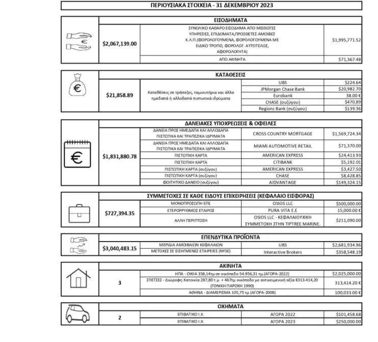 «Στην προσπάθειά του, μάλιστα, να αποφύγει να δώσει το πόθεν έσχες, διαδικασία με συγκεκριμένα δικαιολογητικά, όπως τα ορίζει ο νόμος, ο Στέφανος Κασσελάκης παρουσίασε τις καταθέσεις του, όπως και του συζύγου του, τα εισοδήματά του, κατέγραψε τις συμμετοχές σε 3 εταιρείες, καθώς και τα ακίνητα που διαθέτει. Αποκάλυψε δε, πως δεν είναι πλήρη τα στοιχεία, πετώντας την μπάλα στην εξέδρα, αφού εμφανίσθηκε να δηλώνει πως θα τα καταθέσει όλα όταν τα λάβει από τις αρμόδιες αρχές των ΗΠΑ, όταν, όπως είπε, του σταλούν από την Υπηρεσία Εσόδων, το γνωστό IRS» πρόσθεσε.