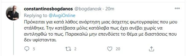 «Πρόκειται για κατά λάθος ανάρτηση μιας άσχετης φωτογραφίας που μου στάλθηκε. Την κατέβασα μόλις κατάλαβα πως έχει ανέβει χωρίς να αντιληφθώ το πως. Παρακαλώ μην επενδύετε το θέμα με διαστάσεις που δεν υφίστανται» ανέφερε ο Κωνσταντίνος Μπογδάνος απάντησε ο ίδιος στο δημοσίευμα της εφημερίδας.