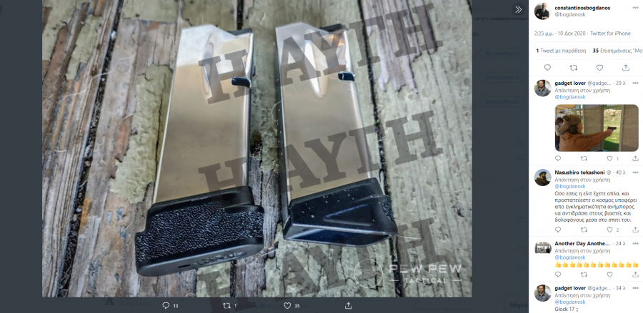 Όπως ανέφερε η «Αυγή», η φωτογραφία προέρχεται από ιστοσελίδα που περιλαμβάνει κριτικές όπλων, και προσφορές για αγορά τους. Συγκεκριμένα, ανέφερε ακόμη πως το όπλο για το οποίο προορίζονται οι γεμιστήρες είναι της εταιρίας Springfield Armory, το μοντέλο “Hellcat”, που περιγράφεται ως το «μικρότερου μεγέθους όπλο 9 mm στον κόσμο»