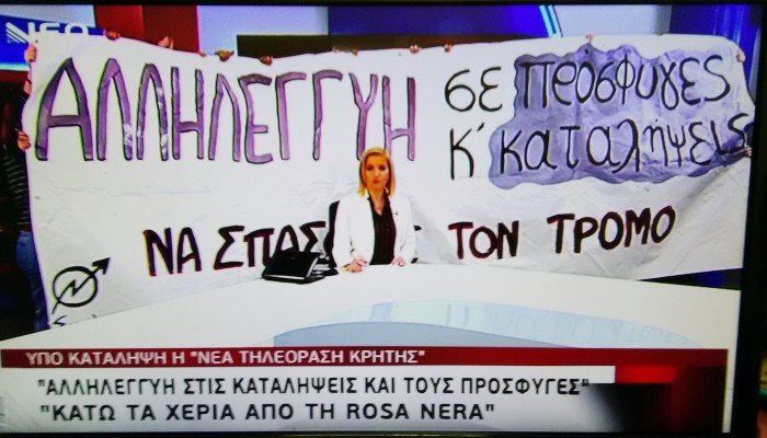 Συμβολική κατάληψη της Νέας Τηλεόρασης κατά τη διάρκεια του δελτίου ειδήσεων της Πέμπτης πραγματοποίησαν μέλη της Συνέλευσης Αλληλεγγύης στις Καταλήψεις και στους Πρόσφυγες. Στην ολιγόλεπτη παρέμβαση, προβλήθηκε η ανακοίνωση της κατάληψης της Rosa Nera στα Χανιά, κτίριο για το οποίο από τον Αύγουστο έχουν γίνει μεθοδεύσεις με αποδέκτη τον Κυριάκο Μητσοτάκη, καλώντας τον να «στηρίξει την αξιοποίηση της περιουσίας του Πολυτεχνείου», στο οποίο ανήκει το κτίριο.