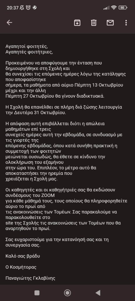 Η Κοσμητεία απαντά στη διαμαρτυρία των φοιτητών ανακοινώνοντας την εξ αποστάσεως διεξαγωγή των μαθημάτων.