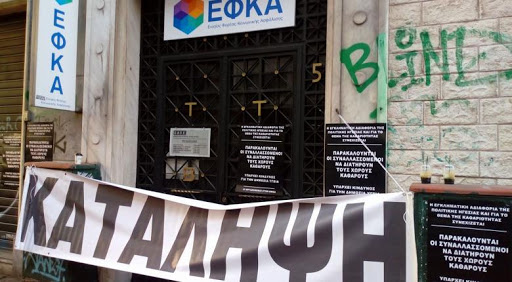 Συμβολική κατάληψη στο νέο κτίριο διοίκησης του ΕΦΚΑ από τη 1μμ ως τη λήξη του ωραρίου πραγματοποιούν μέλη της Πανελλήνιας Ομοσπονδίας Προσωπικού ασφαλιστικών ταμείων (ΠΟΠΟΚΠ), την ώρα που επιτρέπεται κανονικά η είσοδος των ασφαλισμένων και συναλλασσομένων.