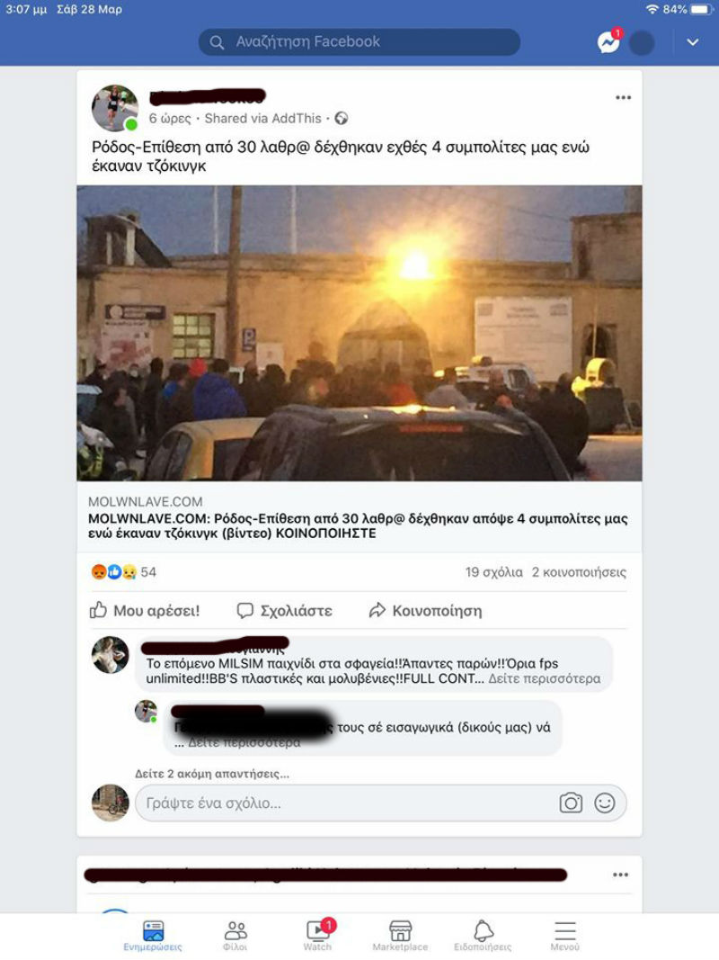 Οι Ομάδες Αλληλεγγύης στα Νησιά της Δωδεκανήσου καταγγέλλουν ότι ακροδεξιές ομάδες ετοιμάζονται να εξαπολύσουν πογκρόμ κατά των προσφύγων που βρίσκονται στα Σφαγεία της Ρόδου, απειλώντας και μιλώντας ακόμα και για πλαστικές και μολυβένιες σφαίρες. Η «Εφημερίδα των Συντακτών» δημοσιοποίησε αναρτήσεις και σχόλια (επισημαίνοντας πως τα πλήρη διαδικτυακά ονόματα βρίσκονται στη διάθεση της εφημερίδας) όπου υπάρχουν ξεκάθαρες απειλές προς τους ανθρώπους που διαμένουν στο νησί.