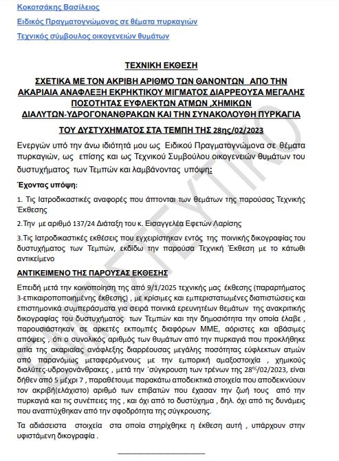 Σήμερα, Παρασκευή 31/01, ο ειδικός εμπειρογνώμονας και τεχνικός σύμβουλος των οικογενειών των θυμάτων του εγκλήματος στα Τέμπη, Βασίλης Κοκοτσάκης, απέστειλε στον Εφέτη Ανακριτή Λάρισας, κ. Μπακαίμη έκθεση η οποία αναφέρει ότι τα 27 από τα 57 θύματα του εγκλήματος επέζησαν αρχικά από τη σύγκρουση αλλά πέθαναν λόγω της φωτιάς που ακολούθησε.