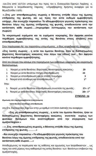 Όπως αναφέρουν οι εμπειρογνώμονες, βάσει των ελέγχων που διεξήχθησαν στα περιεχόμενα των εκθέσεων νεκροψίας – νεκροτομής, διαπιστώθηκε ότι: