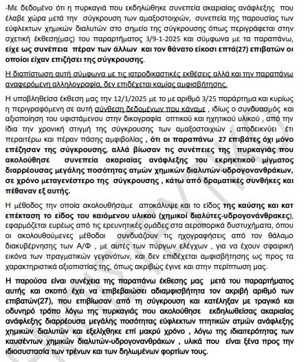 Οι εμπειρογνώμονες σημειώνουν επίσης ότι η έκθεση έχει ως «σκοπό έχει να επιβεβαιώσει αδιαμφισβήτητα τον ακριβή αριθμό των επιβατών (27), που επιβίωσαν από τη σύγκρουση και κατέληξαν με τραγικό και οδυνηρό τρόπο λόγω της πυρκαγιάς που ακολούθησε εκδηλωθείσας ακαριαίας ανάφλεξης διαρρέουσα μεγάλης ποσότητας εύφλεκτων πτητικών ατμών ανάφλεξης χημικών διαλυτών και εξελίχθηκε επί μακρύ χρόνο λόγω της ιδιαιτερότητας των καυσέντων χημικών διαλυτών – υδρογονανθράκων, υλικά που είναι ξένα προς την ιδιοσυστασία των τρένων και των δηλωμένων φορτίων τους».