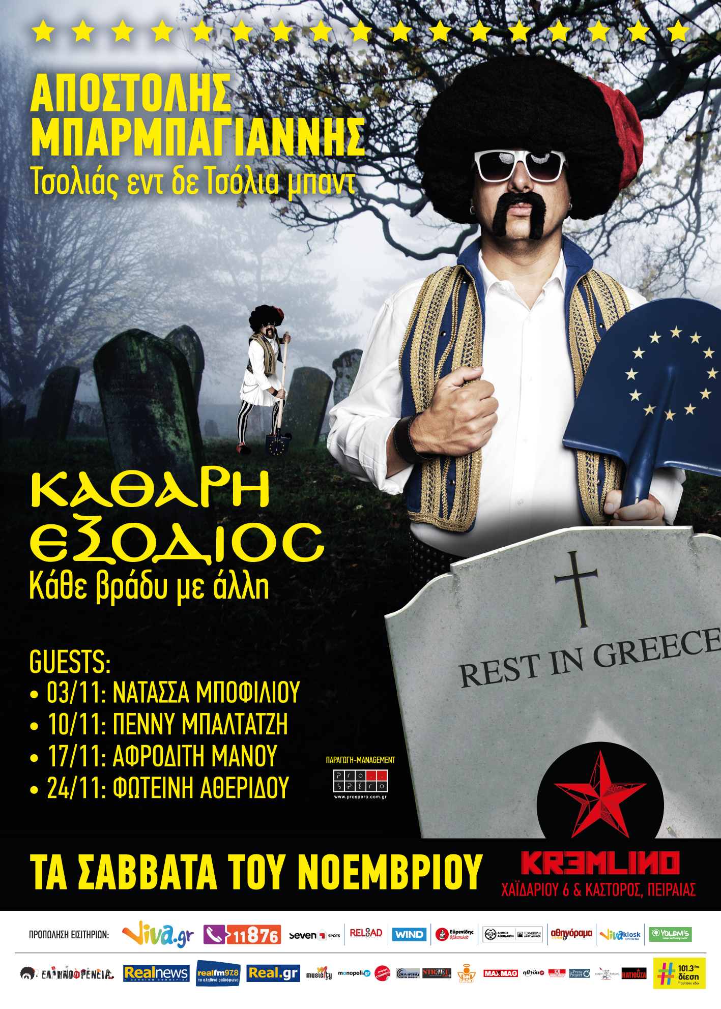 Μετά από μακρά αναμονή και σκληρή προετοιμασία, ο Αποστόλης Μπαρμπαγιάννης ανεβαίνει στη σκηνή του ανανεωμένου Κρεμλίνο στον Πειραιά το ερχόμενο Σάββατο 3 Νοεμβρίου και για τέσσερις μόνο παραστάσεις λοξού πολιτικού λόγου. Οι Τσολιάς εν δε Τσόλια μπαντ θα παρουσιάσουν το αχρείων δράμα «Καθαρή εξόδιος», στο κόνσεπτ «Κάθε βράδυ με άλλη». Από τη σκηνή του θα περάσουν η Νατάσσα Μποφίλιου, η Πέννυ Μπαλτατζή, η Αφροδίτη Μάνου και η Φωτεινή Αθερίδου.