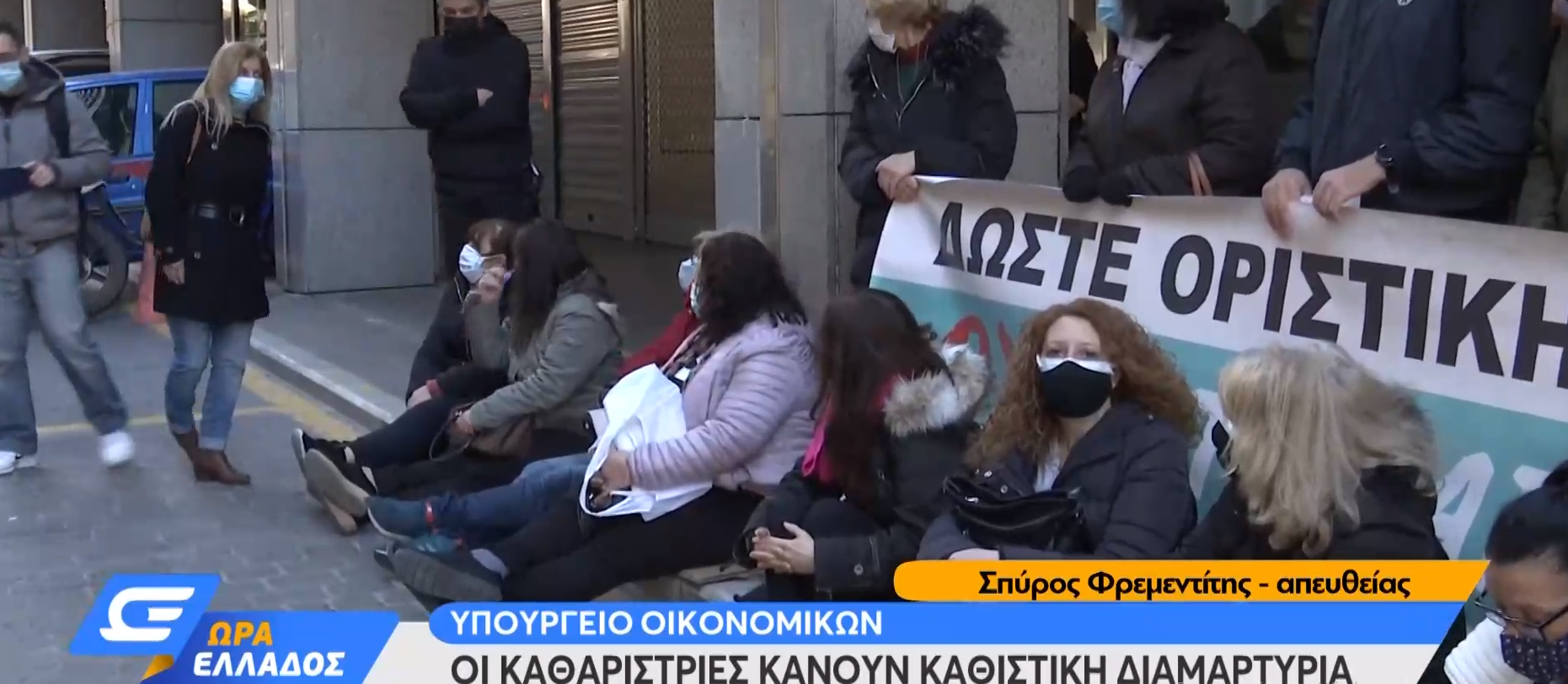 Καθιστική διαμαρτυρία πραγματοποιούν καθαριστές και καθαρίστριες από το πρωί έξω από το υπουργείο Οικονομικών, καθώς η σύμβαση τους λήγει στις 31 Μαρτίου και δεν έχει υπάρξει κάποια απόφαση για ανανέωση της.