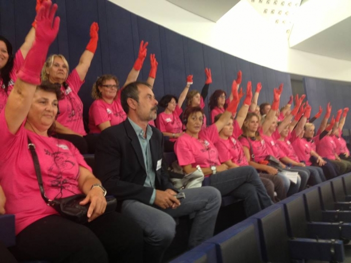 Η αντιπροσωπεία των 30 καθαριστριών παραχώρησε συνέντευξη Τύπου, από κοινού του ευρωβουλευτές του ΣΥΡΙΖΑ μέσα από την οποία ανέδειξαν τις επιπτώσεις από τις καταστροφικές πολιτικές της κυβέρνησης και της Τρόικας στην απασχόληση και τη ζωή των εργαζομένων καθώς και τη σημασία διεθνοποίησης του αγώνα τους που βρίσκεται σε κρίσιμη φάση, ενόψει και της τελεσίδικης απόφασης του Αρείου Πάγου στις 23 Σεπτεμβρίου