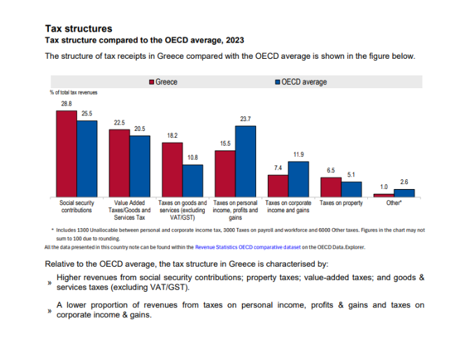 Σύμφωνα με πρόσφατη Έκθεση του Οργανισμού Οικονομικής Συνεργασίας και Ανάπτυξης (ΟΟΣΑ), η Ελλάδα βρισκόταν, το 2023, στην πέμπτη θέση μεταξύ των χωρών με τη μεγαλύτερη εξάρτηση από την έμμεση φορολογία. Το 40,7% των φορολογικών εσόδων της χώρας προέρχεται από έμμεσους φόρους (Φ.Π.Α και Ειδικοί Φόροι Κατανάλωσης). Ο μέσος όρος των χωρών του ΟΟΣΑ είναι στο 31,3%. Από την άλλη πλευρά, ο φόρος εισοδήματος, που θα μπορούσε να είναι κοινωνικά πιο δίκαιος, φορολογώντας τον πλούτο, αποφέρει το 15,7% των συνολικών εσόδων, με τον μέσο όρο του ΟΟΣΑ να είναι στο 23,7%. Επίσης χαμηλότερη του μέσου όρου του ΟΟΣΑ είναι η φορολογία των εταιρικών κερδών (7,4% έναντι 11,9%)