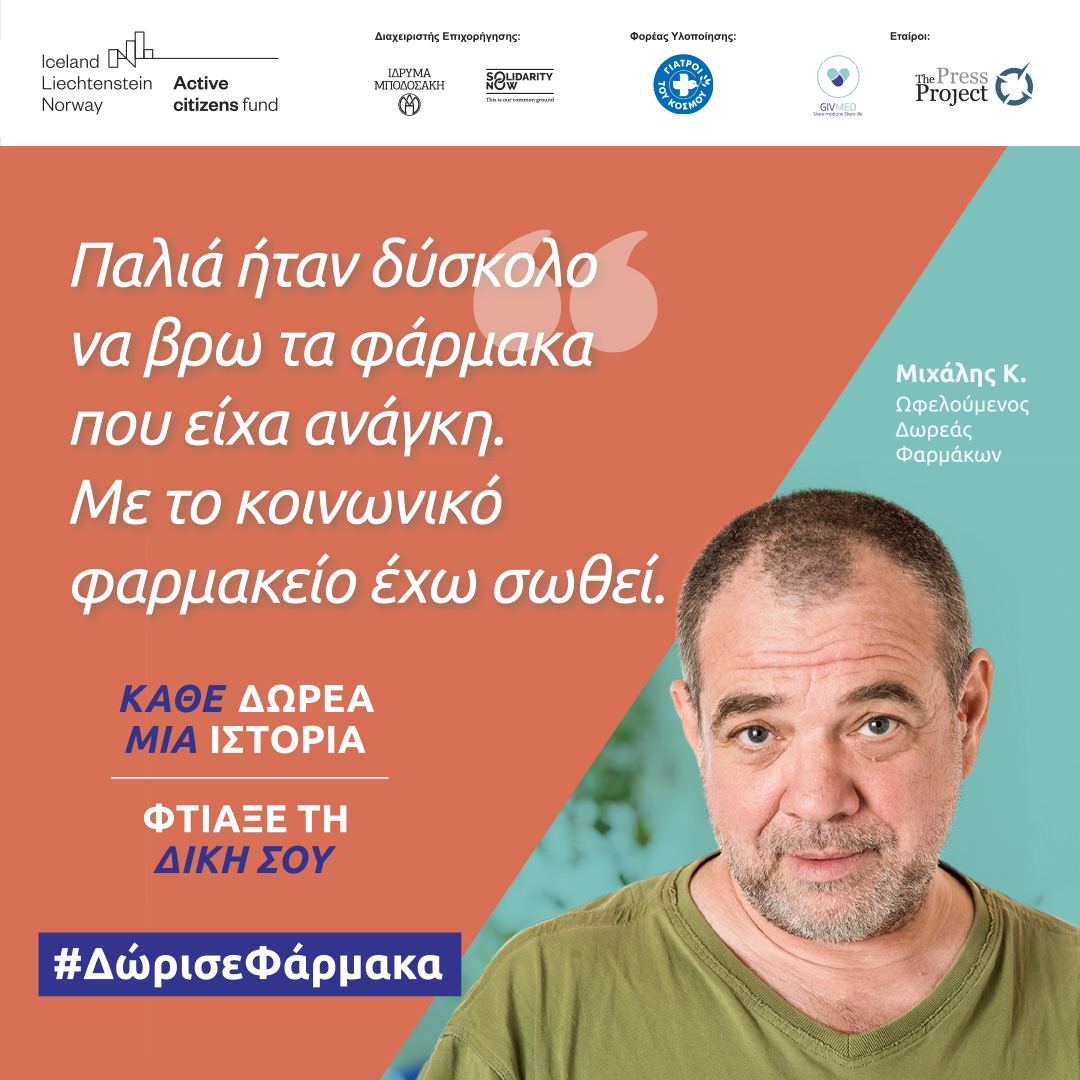 “Παλιά ήταν δύσκολο να βρω τα φάρμακα που είχα ανάγκη. Με το κοινωνικό φαρμακείο έχω σωθεί.”, μας είπε ο Μιχάλης που έλαβε φάρμακα μέσω δωρεάς. Δες εδώ ολόκληρη την ιστορία του Μιχάλη.