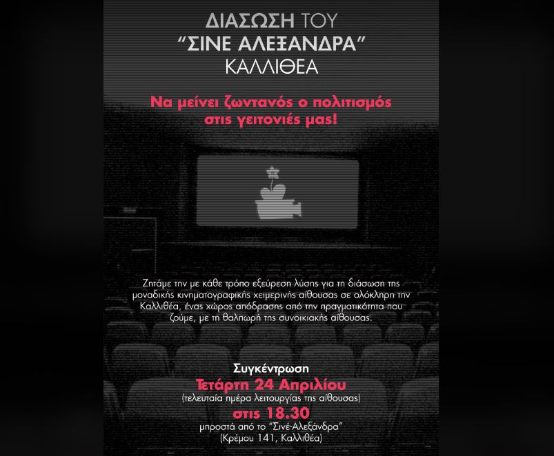 Η είδηση της αναστολής λειτουργίας του σινεμά ευαισθητοποίησε τους κατοίκους της Καλλιθέας οι οποίοι προχώρησαν στην έκδοση ψηφίσματος στο οποίο αναφέρουν ότι «ως κάτοικοι της περιοχής και όχι μόνον, ζητάμε από τους αρμόδιους θεσμούς – φορείς (Δήμος Καλλιθέας, Περιφέρεια Αττικής, Υπουργείο Πολιτισμού, κ.α.), την με κάθε τρόπο εξεύρεση λύσης για τη διάσωση της μοναδικής κινηματογραφικής χειμερινής αίθουσας σε ολόκληρη την Καλλιθέα. Ας κάνουμε όλοι μας ό,τι μπορούμε, ο καθένας από την πλευρά του, έτσι ώστε να διατηρηθεί ένας χώρος απόδρασης από την πραγματικότητα που ζούμε, με τη θαλπωρή της συνοικιακής αίθουσας», και καλούν σε συγκέντρωση την Τετάρτη 24 Απριλίου (τελευταία ημέρα λειτουργίας της αίθουσας), στις 18.30, μπροστά από το “Σινέ-Αλεξάνδρα” (Κρέμου 141, Καλλιθέα) σε ένδειξη υποστήριξης και διαμαρτυρίας.