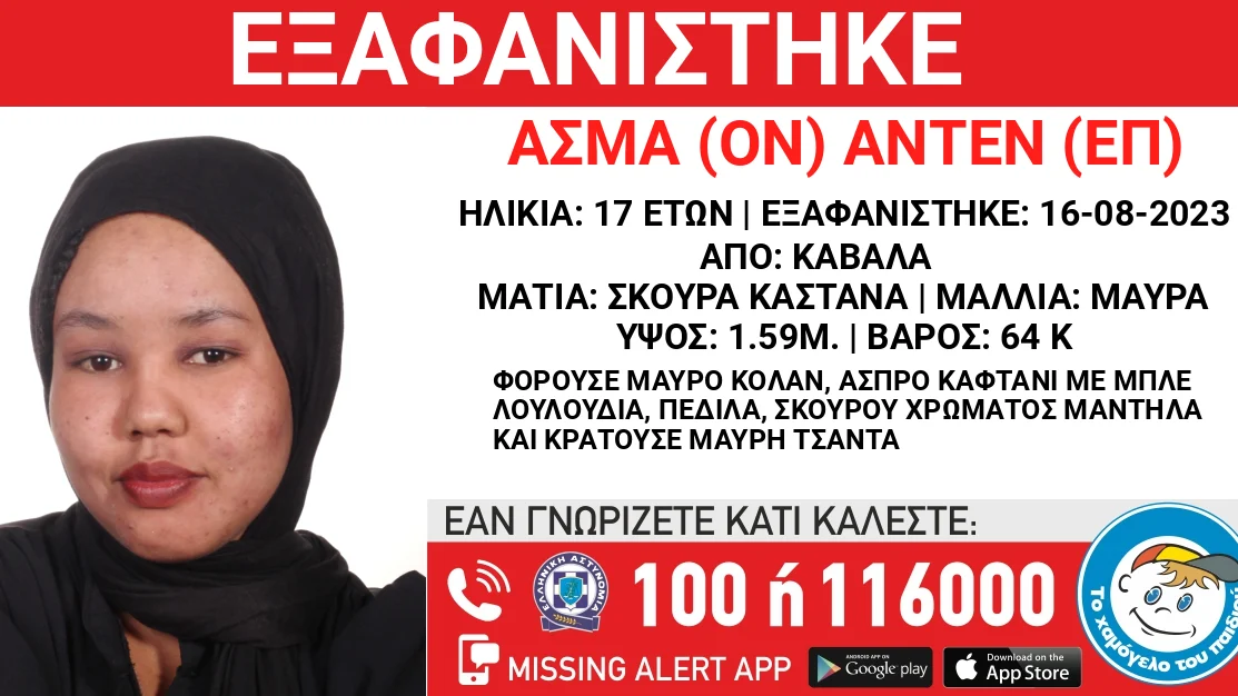 Το «Χαμόγελο του Παιδιού» ενημερώθηκε, και άμεσα προχώρησε στη δημοσιοποίηση των στοιχείων της ανήλικης, κατόπιν εισαγγελικής εντολής, καθώς ενδέχεται να συντρέχουν λόγοι που θέτουν τη ζωή της σε κίνδυνο. Η Άσμα Άντεν έχει ύψος 1,59 μ., ζυγίζει 64 κιλά, έχει μαύρα μαλλιά και σκούρα καστανά μάτια. Φορούσε μαύρο κολάν, άσπρο καφτάνι με μπλε λουλούδια, σανδάλια, σκούρου χρώματος μαντήλα και κρατούσε μαύρη τσάντα.