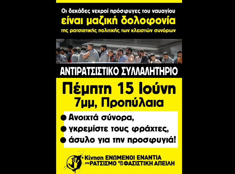 Όλοι και όλες στο αντιρατσιστικό συλλαλητήριο την Πέμπτη 15 Ιούνη 7μμ στα Προπύλαια» γράφει η ανακοίνωση.