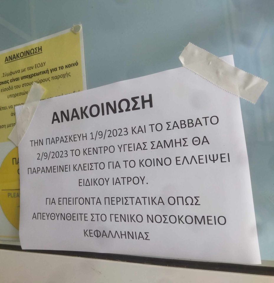 Για το διάστημα που το Κέντρο Υγείας Σάμης θα παραμείνει κλειστό, τα περιστατικά θα απευθύνονται στο Νοκομείο Κεφαλονιάς.