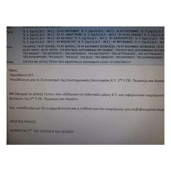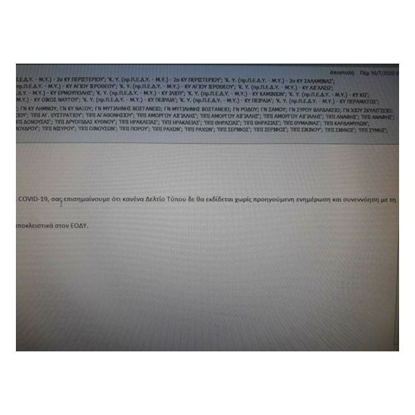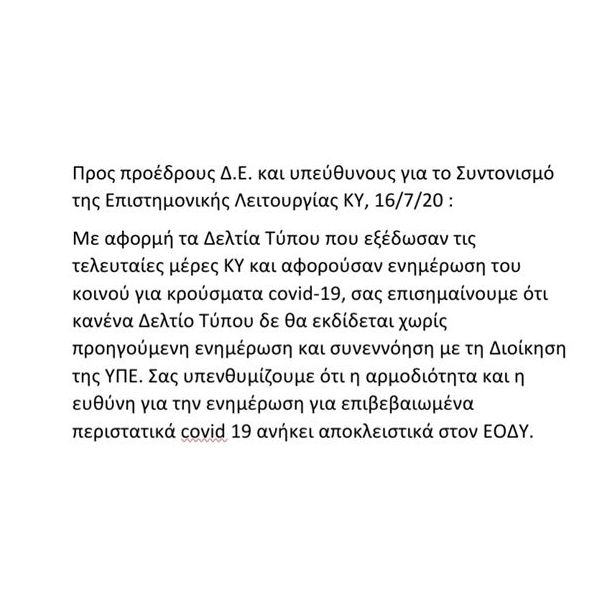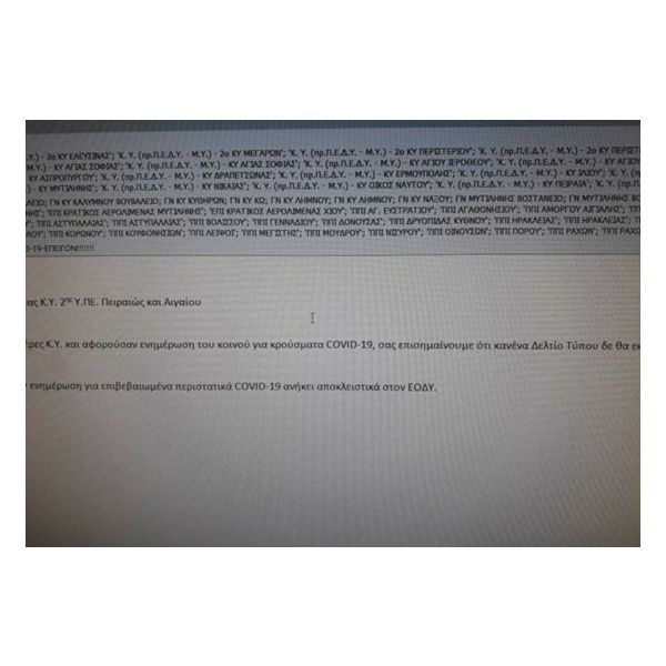 Σύμφωνα με έγγραφο το οποίο και έδωσε στη δημοσιότητα ο τομεάρχης Προστασίας του Πολίτη της Κ.Ο. του ΣΥΡΙΖΑ, Γιάννης Ραγκούσης, Υγειονομικές Περιφέρειες, με αφορμή δελτία Τύπου που δημοσίευσαν Κέντρα Υγείας σε σχέση με τα κρούσματα κορονοϊού που εντοπίστηκαν στις περιοχές όπου επιχειρούν, οι αντίστοιχες Υγειονομικές Περιφέρειες φέρεται να έδωσαν εντολή να μην δημοσιεύουν οι τοπικές μονάδες υγείας σχετικές πληροφορίες και επεσήμαναν πως η αρμοδιότητα αυτή εμπίπτει αποκλειστικά και μόνο στον ΕΟΔΥ.
