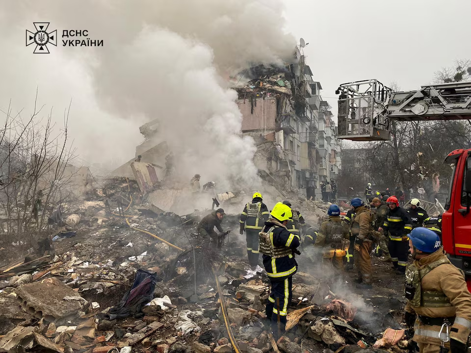 Το υπουργείο ανήρτησε φωτογραφίες στην εφαρμογή ανταλλαγής μηνυμάτων Telegram που δείχνουν το κτίριο με πολλούς ορόφους διαλυμένους και πυκνές στήλες καπνού να υψώνονται στον ουρανό. Πυροσβεστικές δυνάμεις και δεκάδες διασώστες περνούσαν μέσα από τα συντρίμμια.