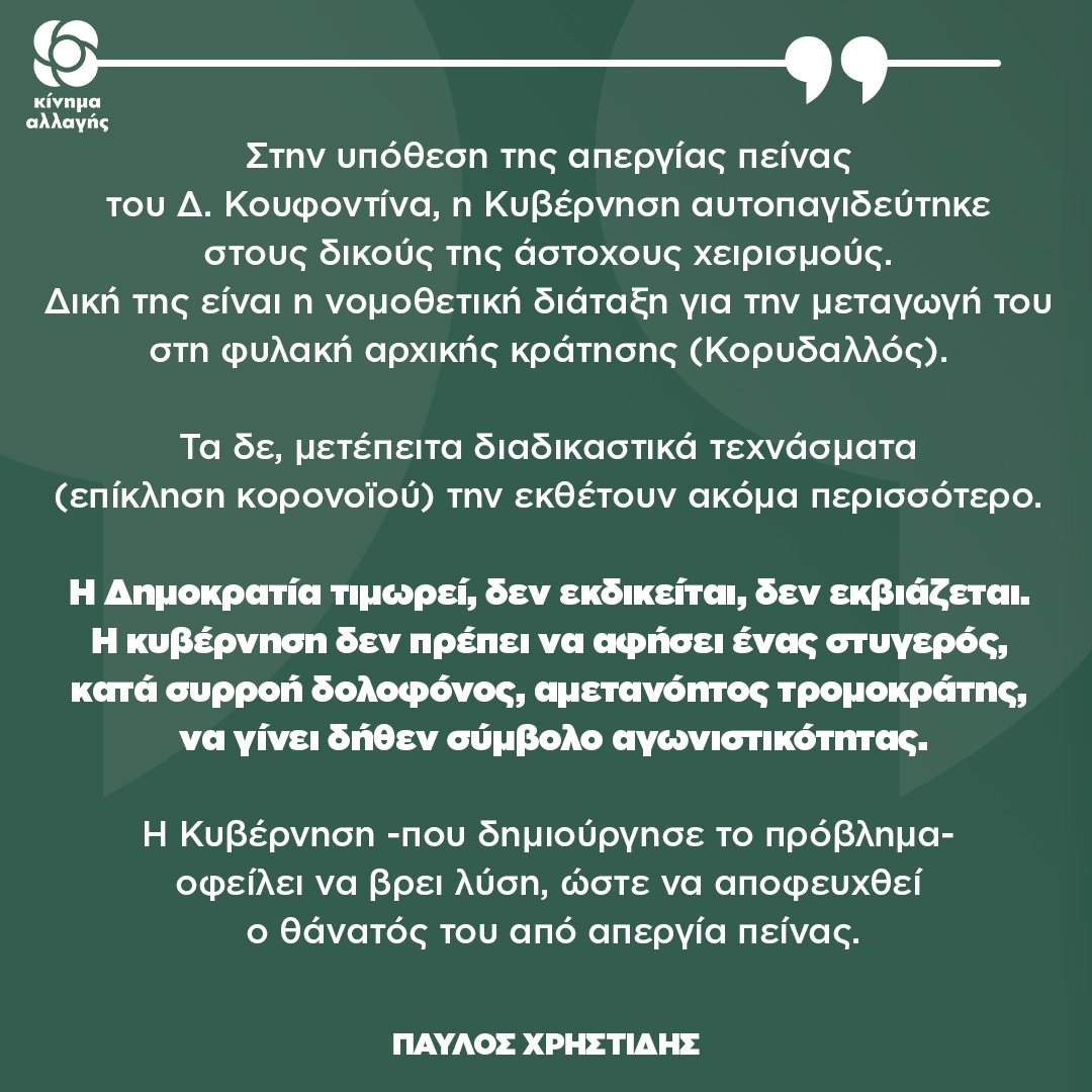 Σε ανακοίνωση του Κινήματος Αλλαγής αναφέρεται ότι ο εκπρόσωπος Τύπου του Κινήματος Παύλος Χρηστίδης, απαντώντας σε ερώτηση δημοσιογράφου για την ανακοίνωση του νοσοκομείου Λαμίας για τον Δημήτρη Κουφοντίνα, δήλωσε :