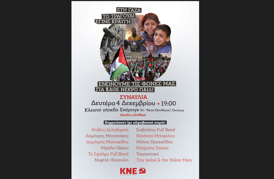 Μεγάλη συναυλία με τίτλο «Στη Γάζα το τραγούδι έγινε κραυγή – Ενώνουμε τις φωνές μας για κάθε νεκρό παιδί» διοργανώνει η ΚΝΕ τη Δευτέρα 4 Δεκέμβρη, στις 19.00, στο Κλειστό Γήπεδο Σπόρτιγκ (Στ. «Άγ. Ελευθέριος», Πατήσια).